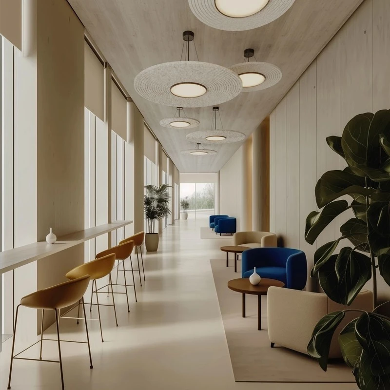 LED acoustic lighting is widely used in commercial, public, and residential interiors where high-quality illumination and effective sound absorption are both essential. By integrating sound-absorbing materials with energy-efficient, glare-free LED light sources, these fixtures improve speech intelligibility and reduce ambient noise in environments such as open-plan offices, conference rooms, retail stores, hospitality venues, airports, museums, libraries, and healthcare facilities. Linear acoustic lights and sound absorbing fixtures create calm, comfortable atmospheres in busy spaces like hotels, restaurants, cafés, and shopping centers, while also enhancing residential areas including living rooms, bedrooms, corridors, and lobbies. This dual-function solution combines spatial acoustic performance with elegant architectural lighting design, making LED acoustic lighting a versatile choice for modern interiors.