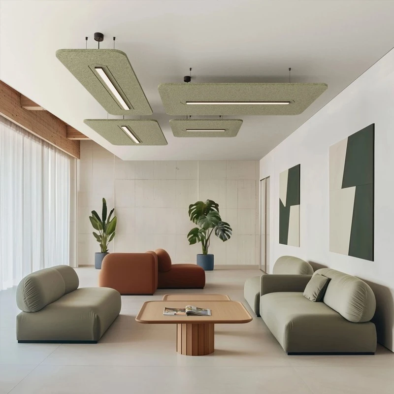 Combines high-performance LED lighting with integrated PET or wool felt panels to reduce ambient noise in shared spaces.